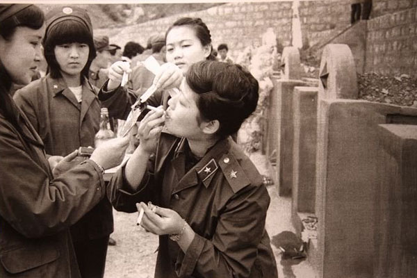 点燃香烟祭奠战友的女兵,画面中右边这位女兵叫于洁(音),剧拍摄者王红接受凤凰卫视采访时说,这位女兵根本不会抽烟,但当时为了祭奠战友,她吸了很多根烟。