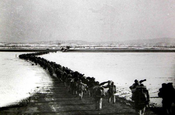 1950-1953年朝鲜危机。1950年10月25日,中国人民志愿军入朝参战。在中朝军队凌厉的攻势面前,美军节节败退,一直退到三八线以南,美国部分高级官员甚至认为朝鲜战争的爆发是苏联大规模入侵欧洲的前兆。“联合国军”最高统帅麦克阿瑟为挽救败局,乞求于原子弹的巨大威力,亲自建议杜鲁门总统动用原子弹,企图遏制中朝军队的进攻。杜鲁门于7月1日下令秘密在关岛地区部署原子弹部件,后因顾忌苏联的力量,杜鲁门拒绝了麦克阿瑟的请求。图为1950年10月19日,中国人民志愿军秘密跨过鸭绿江,赴朝参战。
