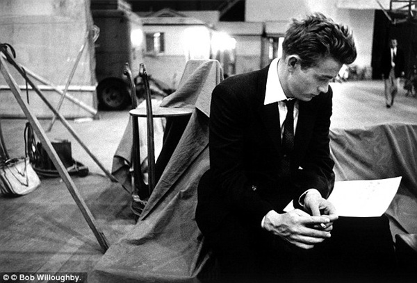 1955年,詹姆斯·迪恩在电影《无因的反抗》的片场看台词。