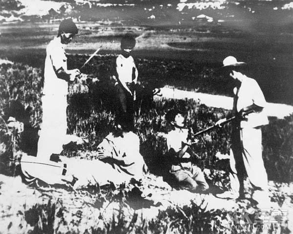 三名北朝鲜士兵正在处死这些韩国的士兵或平民,其中一人似乎在求饶。