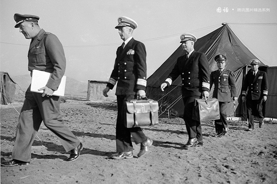 朝鲜战争1950年爆发,前后打了3年多,交战双方一直处于僵持状态,均无力吃掉对方。自1951年开始,中朝方面就和联合国军展开谈判,其中边打边谈的时间长达747天,大小会议召开了575次,堪称近代史上最复杂的停战谈判。图为1951年12月,板门店,联合国军代表离开双方举行谈判的帐篷。