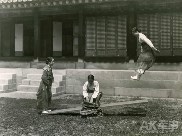 1931年,朝鲜,两名女青年正在玩跷跷板。这幅照片由美国《国家地理杂志》的摄影师罗伯特·摩尔拍摄。