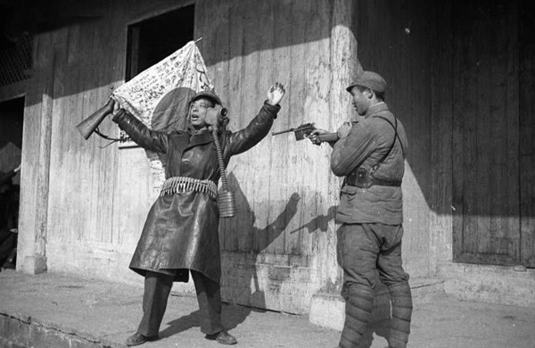 1943年12月,一名中国士兵和战地记者扮演国军捕获日本兵。