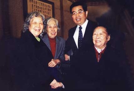 前中共中央总书记、国家主席、军委主席胡锦涛同志亲切会见著名老红军、谢觉哉同志夫人王定国(右一),刘少奇同志夫人王光美(左二),王稼祥同志夫人朱仲丽(左一)