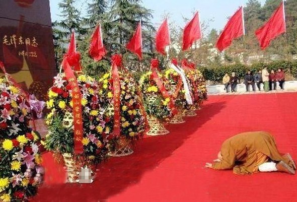 毛泽东诞辰115周年时有僧人赴韶山跪拜。
