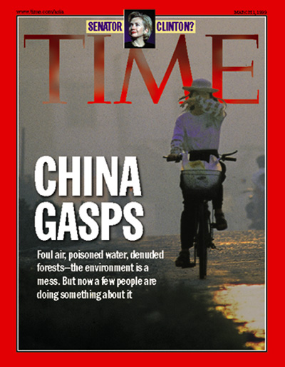 1999年3月1日。封面:China Pollution(中国污染),标题:China Gasps(中国呼吸)烟雾弥漫的道路上,中国人一手骑自行车一手捂住口鼻,封面故事讲述中国环境污染问题。Ly3老兵苑
