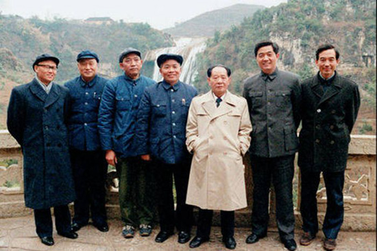 1986年2月5日,时任贵州省委书记的胡锦涛陪同时任总书记的胡耀邦在黄果树瀑布考察。右一为温家宝,时任中央办公厅主任。