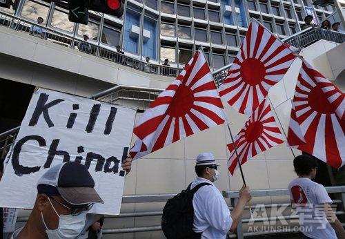 资料图:日本人在中国驻日使馆门前抗议,有人举着Kill China的标语