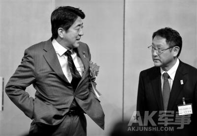 7日,东京,安倍晋三与企业界代表举行会晤。安倍晋三(左)与丰田汽车总裁丰田章男交谈时,疑似当众提裤子。