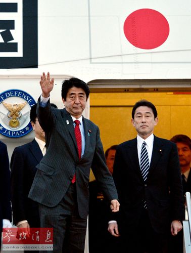 资料图:安倍晋三在外相岸田文雄等人陪同下乘机前往美国