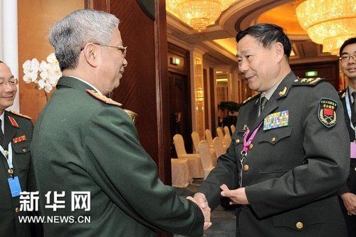 6月1日,中国人民解放军副总参谋长戚建国(右)在新加坡举行的香格里拉对话会期间会见越南国防部副部长阮志咏。