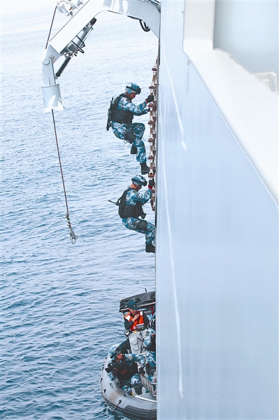 本报彼得大帝湾7月9日电 记者钱晓虎、吕德胜报道:今天,日本海彼得大帝湾雨雾弥漫,能见度不足50米。在恶劣的海况条件下,“海上联合-2013”中俄联演按计划展开了联合防卫作战演练。联合防空、海上补给、通过潜艇威胁区、联合护航、联合解救被劫持船舶、打击海上目标等6大科目轮番上演,掀起了一个个高潮。