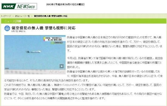 【环球网综合报道】日本NHK电视台9月17日报道称,鉴于日本防卫省首次确认到有中国军方无人机在“日本周边空域”飞行,目前正在就应对中国无人机靠近“日本领空”时的应对方法进行磋商。日防卫省认为,如果中国军方无人机“侵犯日本领空”,造成威胁日本国民安全的事态,日方将考虑对中方无人机进行击落。7Vg老兵苑