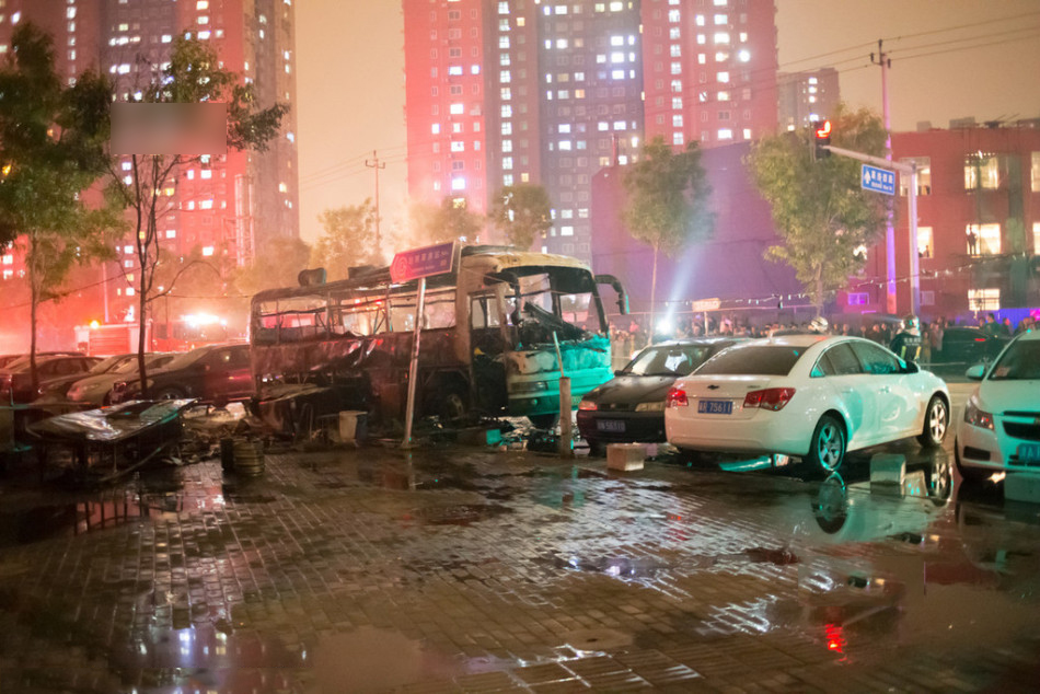 2014年5月6日,北京,地铁六号线草房站附近一辆大巴车起火。大巴车被做烧烤生意的小贩当做经营场所,消防员抵达后将煤气罐从大巴车上抢出,小贩夫妇已被警方带走调查。被烧毁的大巴车。