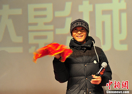 2月22日,周星驰带着现场表演东北二人转中常用的转手绢经典动作。