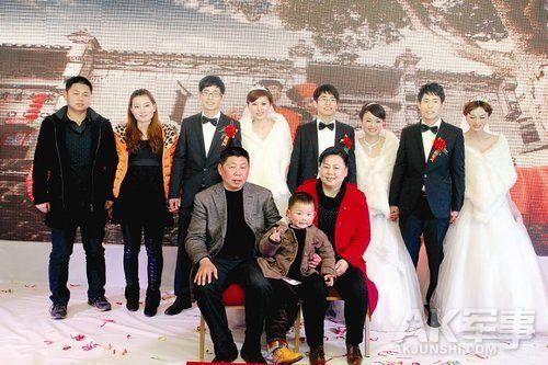 昨晚6时许,大冶某大酒店2楼喜气洋洋,三胞胎兄弟的婚礼在这里热闹举行。舞台屏幕上打出“爱的三次方”几个字,并反复播放着幻灯片,都是三兄弟从小到大穿一样衣服的照片。