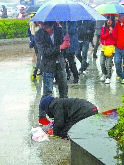 博主小刘昨天上午到光谷考试。经过步行街人行通道附近时,见一位年龄六七十岁的老奶奶正跪在闹市乞讨,当时下着瓢泼大雨,老人头上都是水,地上摆着个碗,里面只有几枚零钱,十分可怜。正当他在心里感慨时,一位学生模样的男生从后面快步跑来,将手里的伞撑到乞讨奶奶头上,又蹲下来和老人说了什么话。一会儿后,男生搀扶着乞讨奶奶到地下通道里坐着。他目睹这一幕,拍下发到微博上。由于雨太大,他没看清男生的正脸,但男生扶着老人的背影,让他心里特别温暖。