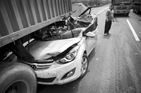 3月27日,白色的现代轿车撞进货车车尾的下面。