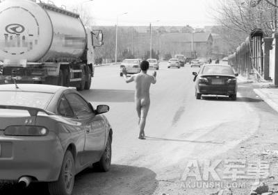 一名男子一丝不挂的走在马路上,其身后还跟着一辆轿车。