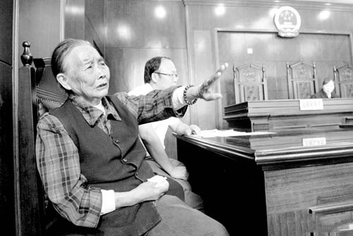 原告李兰渝(化名)老人在法庭上失声痛哭大喊“儿子忘了娘”。2013年7月16日,四川“精神赡养”首案在大邑县王泗法庭开庭。