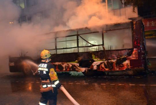 15日晚19时20分,四川宜宾市城区文星街某医院门口公交车站台处一辆公交车突然起火,经消防官兵奋力扑救大火成功扑灭,幸未造成人员伤亡。