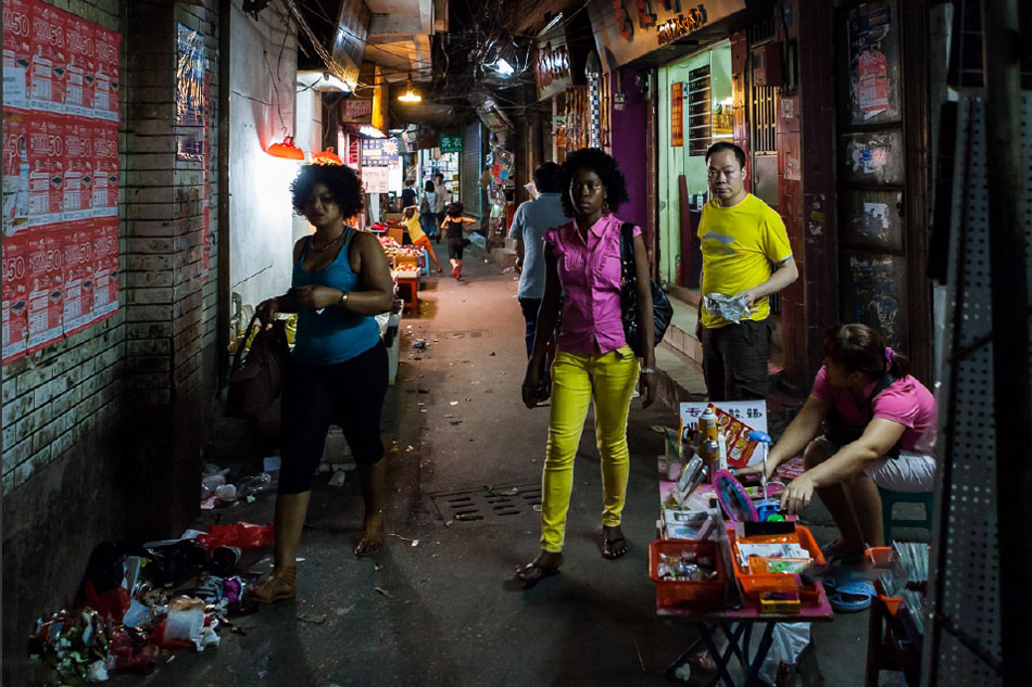 看得出来,李东受马格南图片摄影师影响很深,他在纷繁熙攘的街道和人物百态中撷取出了一张张典型人物、典型瞬间、典型构图,似乎又让我们重温了历史的“经典”。尤其需要提到的是,李东对色彩本身的研究甚为深厚,在这系列照片中,他大胆的铺陈色彩,浓烈炽热,饱和度很高的红色、黑色和黄色成为炫目的主色调,这种抢眼的色调与其说是为了煽情和夺目,不如说它更吻合了摄影师想传达的某种理念,在他看来,异域异族千里迢迢汇聚广州本身就有某种魔幻色彩,他们似乎穿越时空而来,而在广州,在登峰直街,他们乌黑发亮的皮肤、炫目的装扮与本地居民的杂糅混搭,借助夜晚昏黄幽暗的灯光,更是造就了一个扑朔迷离、亦真亦幻的斑斓世界,这世界交织着冒险和欲望、困境与机会、惊颤与梦想、绝望与希望。而这也与广州草根、鲜活的文化气质一脉相承。