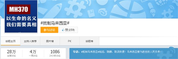 新浪微博的#抵制马来西亚#已然成为热门话题,28万人参与讨论,一周内参与讨论的网友达到4万人次。“拖延,隐瞒,耽误救援!马来西亚要为逝世的人民负责!”不少网友强烈谴责马方政府处理MH370事件不当。