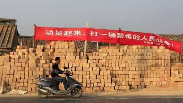2014年1月5日,实地探访制毒“第一大村”广东陆丰市博社村。2013年最后几天,这里在广东警方的“雷霆扫毒”行动中被清剿出近3吨冰毒,18个特大制贩毒犯罪团伙被摧毁,182名涉毒嫌疑人被抓捕。图为现在三甲地区道路上设有的禁毒标语。