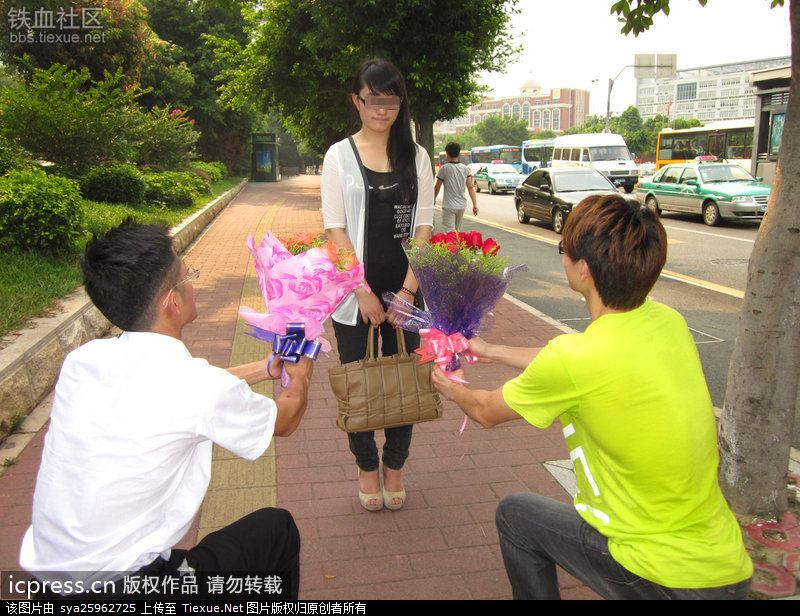 2012年7月19日下午,两名男子在广州天河区中山大道上社路段,手捧玫瑰花拦截下心仪女生的脚步,当众下跪向其求爱,引来过往的路人侧目。7月19日15时25分左右,市民冯先生和朋友到上社BRT坐车,这时,一幕特别的景象映入了他的眼帘:在中山大道的人行道上,两名大约二十多岁的年轻男子各手捧一束玫瑰花,单膝跪地向一名年轻的女生求爱。“我活了48岁,两个男的向一个女生求爱还是第一次看见,现在的年轻人爱情竞争也太激烈了。”