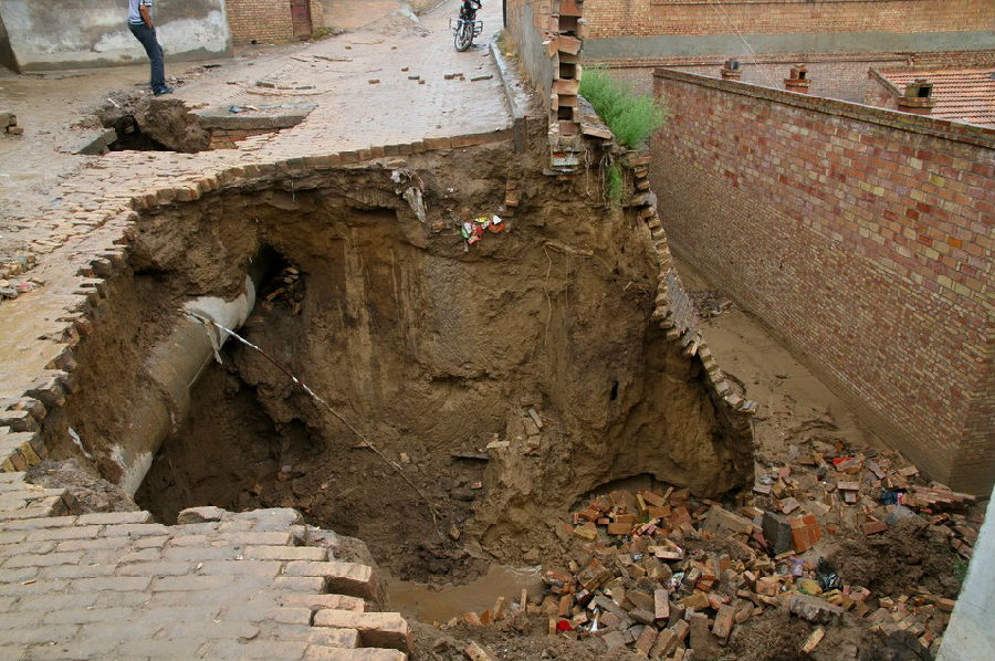 环县环城镇红星村一路面现大坑,农家宅基地被洪水冲毁。