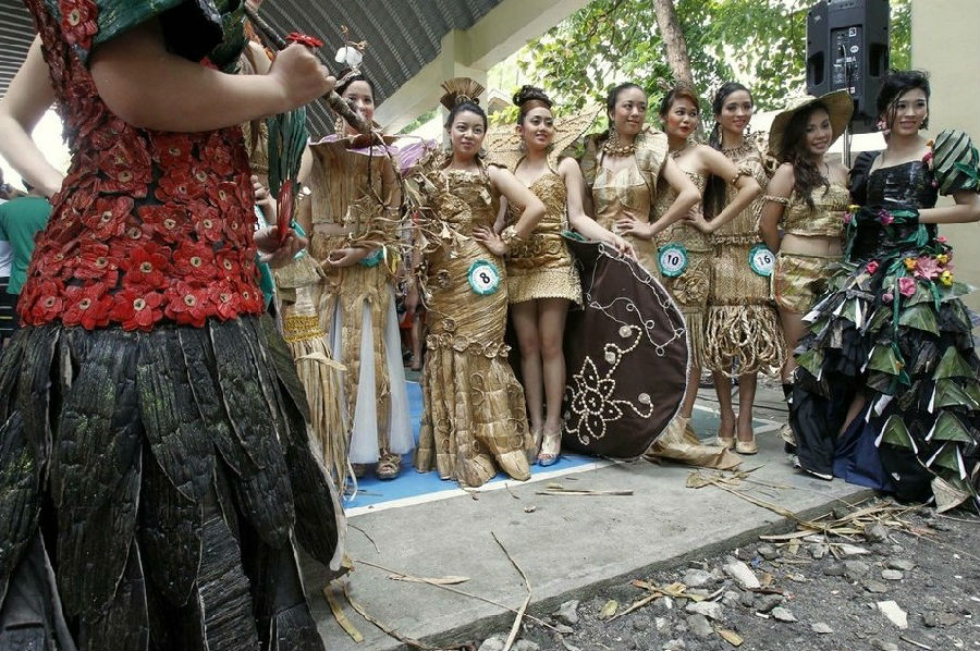 在马尼拉郊外的拉斯皮纳斯,姑娘们身穿用干枯荷叶制成的服装,参加荷花小姐盛装巡游,为当地的特色的草编工艺做宣传。