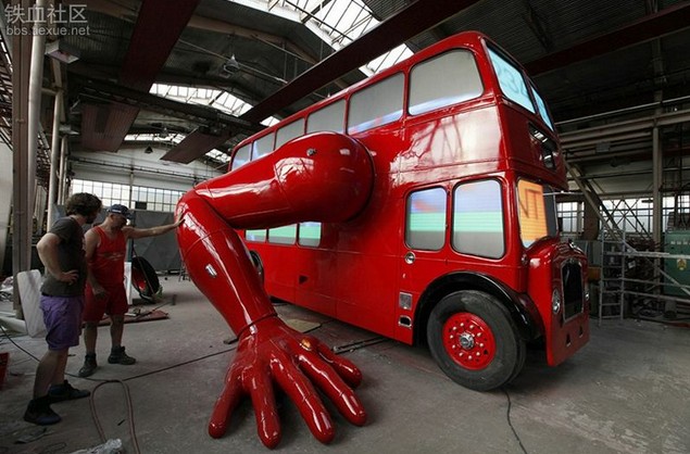 2012年7月22日,俯卧撑双层大巴被置于英国伦敦捷克奥运代表团总部外,一辆正在运行的双层大巴从其身边经过。