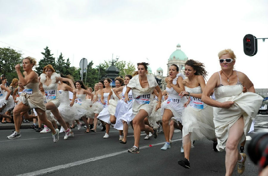 7月22日,选手们在塞尔维亚首都贝尔格莱德参加“新娘赛跑”比赛。