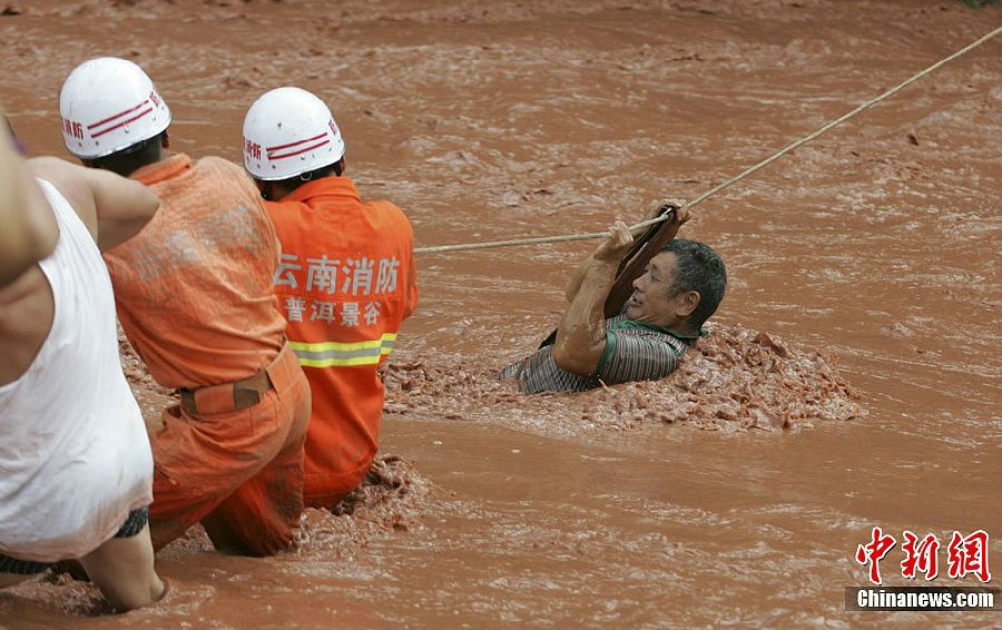 据介绍,7月30日23时至31日6时,景谷县境内突降单点暴雨,引发泥石流洪涝灾害。据初步统计,景谷县3.72万人受灾。灾害造成国道323线景谷到宁洱段发生路基沉陷、公路坍塌。7月31日,云南省救援人员正在营救泥石流中的被困民众。7月30日晚23时至31日6时,云南省景谷县境内突降单点暴雨,引发特大泥石流洪涝灾害,已造成3人死亡、11人失踪、重伤3人、轻伤84人。中新社发 李文云 摄