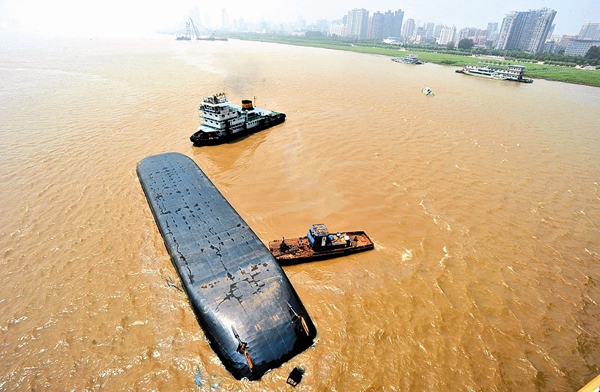 8月15日中午11时许,一艘载有钢材的千吨级驳船,从长江驶入汉江时,在两江交汇处龙王庙水域意外翻覆,一名船员在翻船时跳水逃生,被附近小渔船救起。驳船随后倒扣在江水中,沿江快速向下游漂去。武汉海事局从监控系统发现警情后,立即派出海巡艇前往现场,并协调“汉港拖1004”等两艘拖船前往救援。武汉长江航道救助打捞局主动派出“救捞测301”船前往协助救援。本报记者谈海亮 刘俊华 通讯员毛波 丁振骏 刘锦辉 摄影:记者李响 胡九思