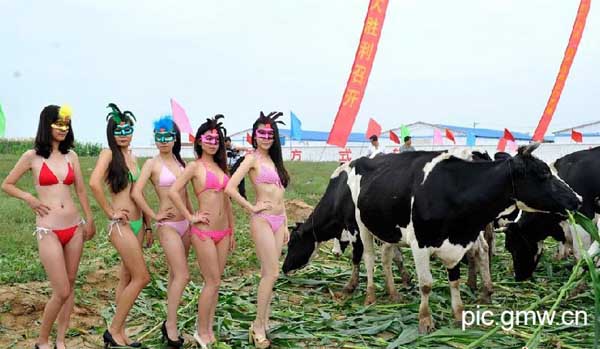 据报道,今年8月18日,山西省朔州市山阴县联合美国奥兰治华威县举办首届“大赛”,通过奶牛的产奶质量、外貌、家族血统选出首届“奶牛小姐”冠军。众多着比基尼的“牛模特”当场助阵。