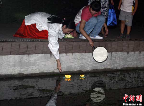 年轻女子汉服装扮参加“拜织女”仪式 求赐姻缘