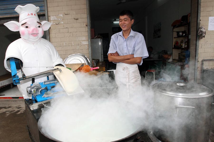 近日,西安南郊一家刀削面馆老板为了节约开支,花一万多元买来一个猪八戒造型的机器人给自己当削面工。
