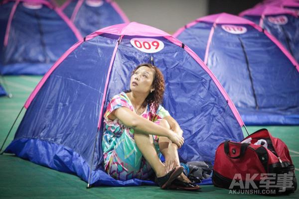 8月29日,在天津大学新体育馆内,一名新生家长坐在“爱心小屋”外休息。