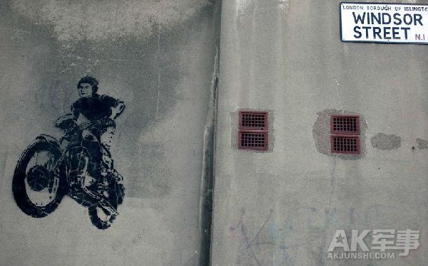 街头艺术家斑比的这幅作品刻画了在伦敦温莎街骑摩托车的女王形象。