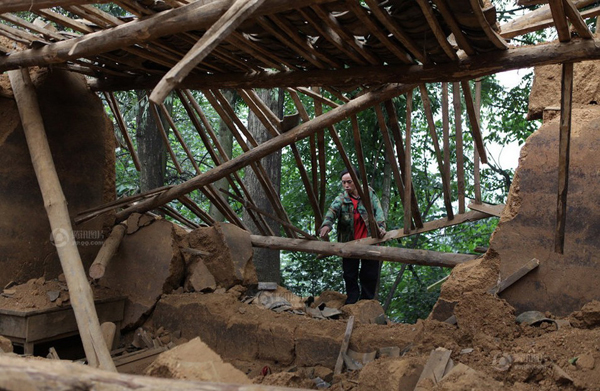 2012年9月9日,朱银全在查看云落小学的废墟,他指的那个地方就是被埋的三个孩子的位置。