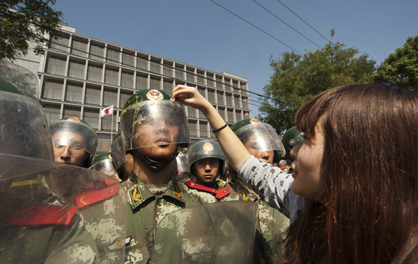 2012年9月15日,日本驻华使馆前,一个女孩儿为武警擦去头盔上的鸡蛋残液。吴迪/摄