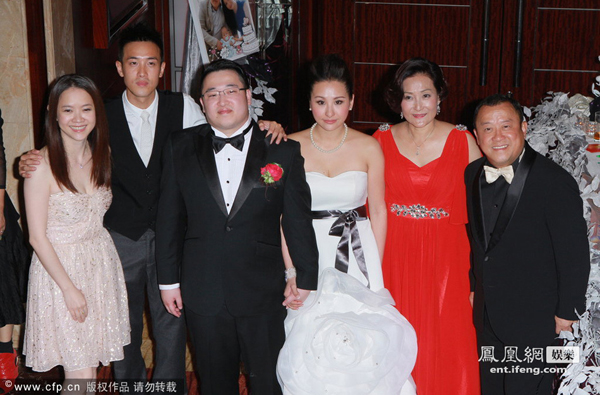 2012年9月22日讯,香港,曾家有儿初长成!恭喜香港主持一哥曾志伟小儿子曾国猷9月21日大婚之喜,终于有孩子小登科,作为爸爸的志伟哥当然全程笑不拢嘴。而一众明星红人包括鲁芬、钟珍等捧场。就现场所见婚礼场地并不大,志伟哥表示觉得朋友太多,邀请起来难以决择,所以大部分只照待亲属以及少数圈内好友。而大婚之日刚好是小孙女的百日诞生,问到会想国猷多生几个可爱小孙儿时,志伟则笑言要看儿子跟媳妇的造化。至于国猷的哥哥曾国祥看到弟弟女儿的可爱模样,还未结婚的他反倒觉得松一口气,对于感情表示顺其自然。在礼物方面,志伟哥豪掷金钱包开三十多席宴请宾客,而国祥则与其他兄弟姊妹联手请一对新人海外度蜜月。 图为曾志伟、曾宝仪和新郎新娘合影。
