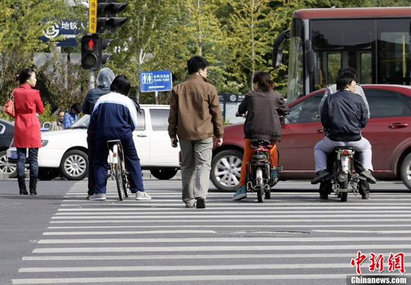 图为10月16日,北京市某一十字路口,行人们不顾交通灯红灯警示,三五成群地通过马路。