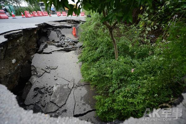 2012年8月22日,江苏省扬州市临江路路面塌陷出现的大坑。