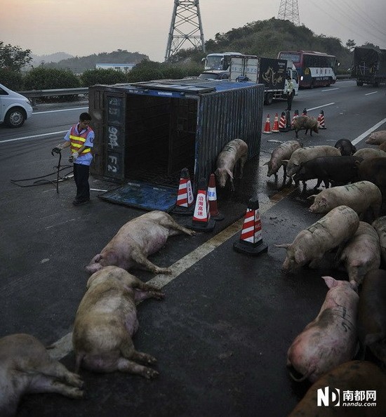 运猪车爆胎侧翻 高速路上演“人猪大战”