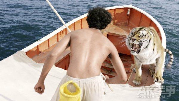为了让这只数码老虎更真实,团队找来了4只老虎作为研究参考,其中一只名为 King 的老虎被选作理查德·帕克的原型,并在几个重要场景中出镜,比如那场老虎在海里游泳的戏。当然,老虎并没有真的下水游泳,工作人员在老虎的围栏里搭起了一条可移动的小船,并拍摄了一些镜头,加上后期处理完成整个游泳的场景。