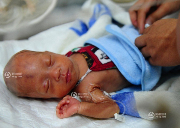 2012年9月4日,安徽长丰县人民医院,遭遗弃的“小不点”正在医院里抢救。