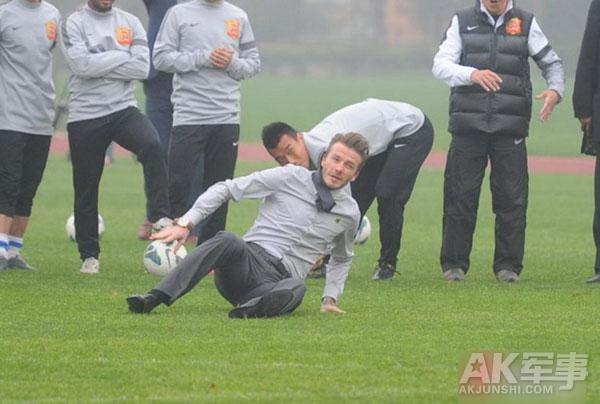 贝克汉姆表演任意球时意外滑倒 面露尴尬笑容
