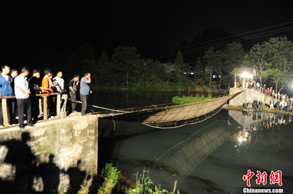 据凤凰县官方介绍,5月1日晚9点10分左右,凤凰县桃花岛篝火晚会跨河吊桥因受力桥墩断裂,出现桥面倾斜,从篝火晚会散场的游客经过吊桥时落水。